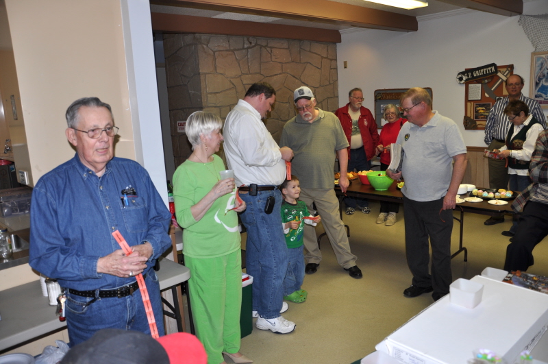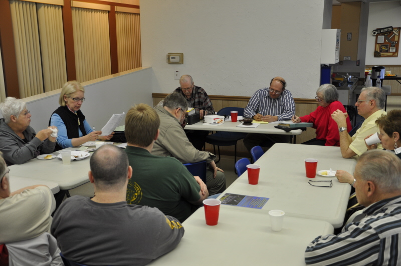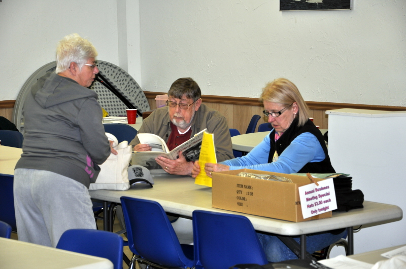 Diane Hopp talks to Roberta Uhrich as Mike looks through his newly won train book. A few more items of the raffle are still waiting to be won which will conclude the activities for the evening. |