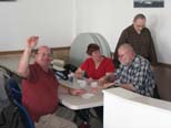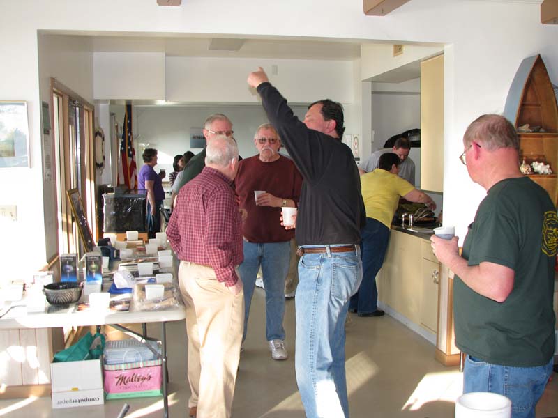 Robbi has started putting the food on the tables as the members help themselves to the snacks. Lew Fowler, Ron Trenhaile and Ken Brooks listen to Frank Foti tell a "tall" one as Rick Nagy watches. |