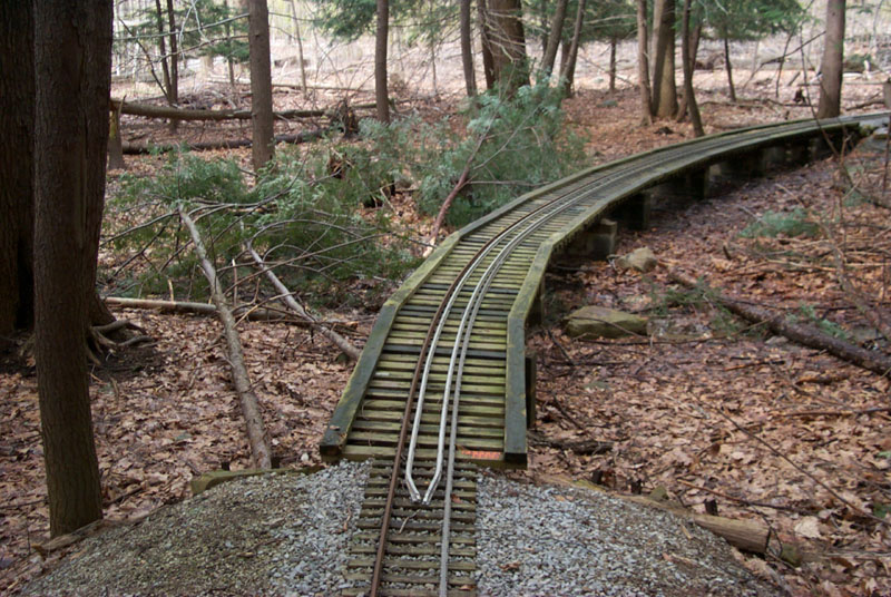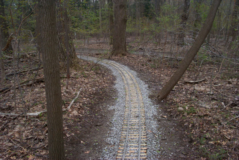 The new Branch Line track curves around following the Park service road through our area above the Truss Bridge in the background. |
