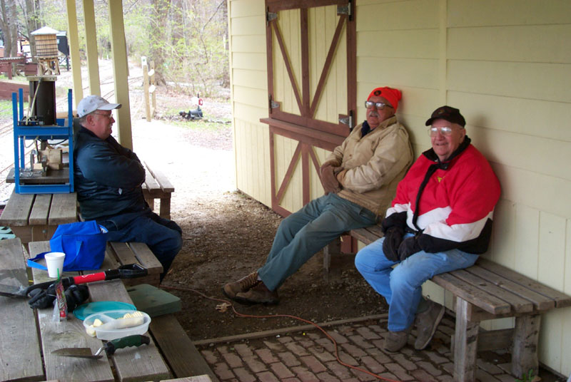 The rains came back so we headed for the switch shed. Jerry Bell talking to Frank with Ted Nyland behind Frank. |