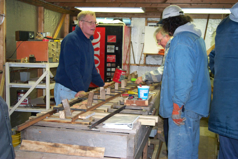 The tree that lost its' branches in the snow storm. Patrick, behind Ron Trenhaile, Dick and Frank Foti fasten down the last piece of replacement rail. |