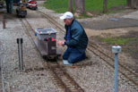 Dave Foster, Peter and George finishing up the last 174 ties with the press. Ray doing switch maintainance up by the station. |