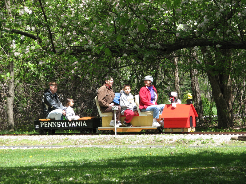 Sue Knox as conductor waits after the train unloaded its passengers. Ethan held by his Dad, John, takes a short ride as Snoopy edges closer to the loading area with his Mom, Amy, behind them. |