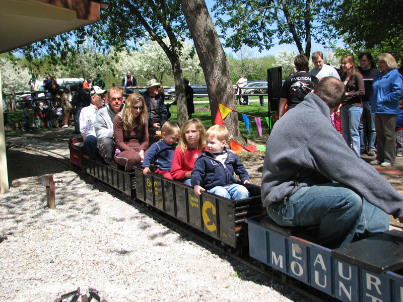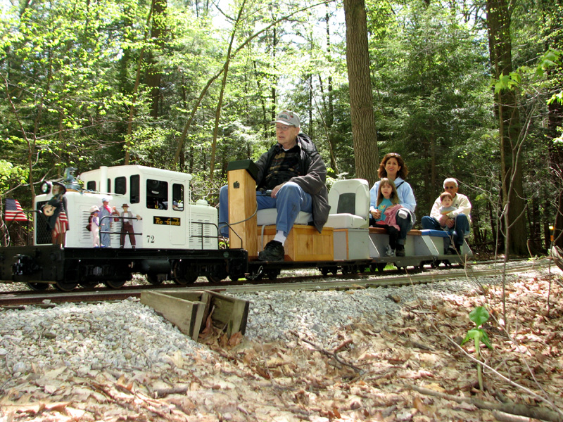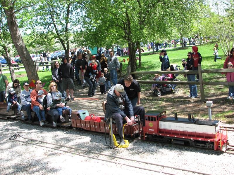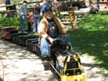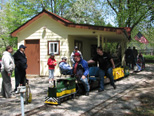 The kids, big and small, about to enjoy a ride through the woods. Jake Knox at the controls of George Metts "Scrappy" running the engine on the loop behind the station. |