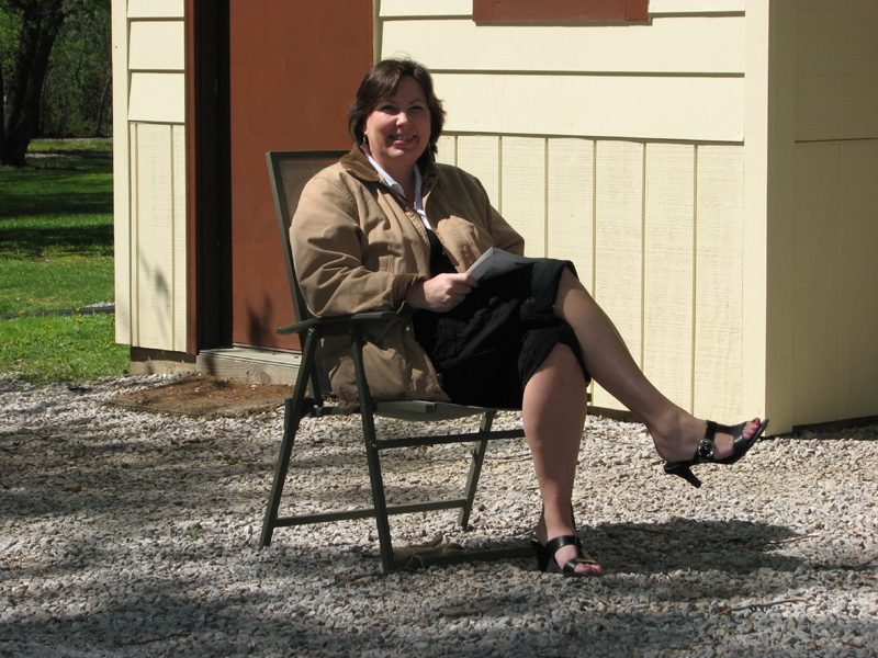 It's a little on the cool side today but at least the sun is shining as Kitty Shriver waits for her train to be loaded. Scott Hewis is running the Park locomotive today and waiting for passengers to load. |