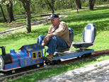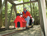 Skip Frank crossing Cider Bridge with a trainload of passengers. Rick with the GP38 and passengers having just passed through Zip Junction. |