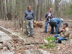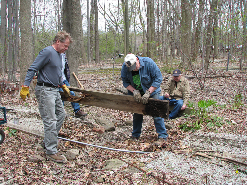 With Greg behind Marty holding one end and Ken the other end you can see right through the rotted out hole in the beam behind Marty's hand. Dick, our track master, came over to check out the progress as the crew starts putting down bricks for the bridge abutments. |