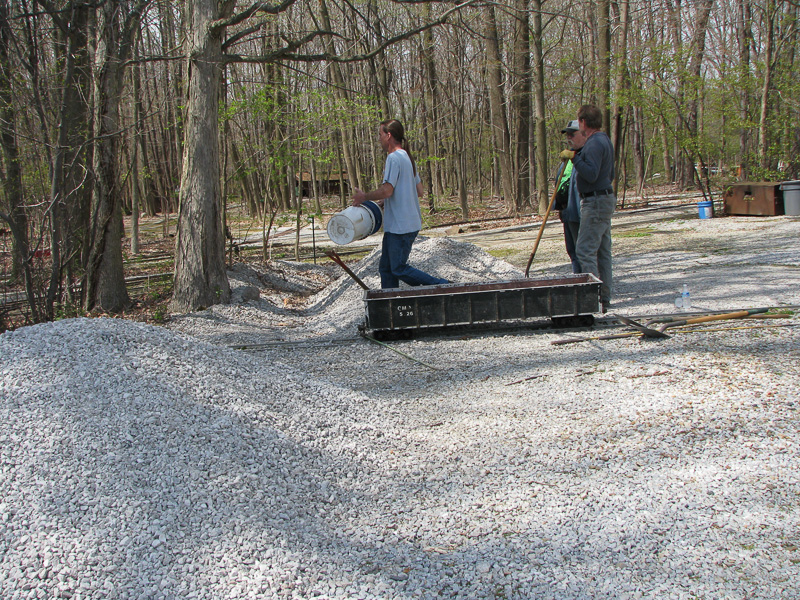 Lew Fowler and Bill Besselman showed up as Marty and Greg place and level the support bricks for the bridge abutments. After determining the height they need due to beam thickness, Greg taps the bricks to level them. |