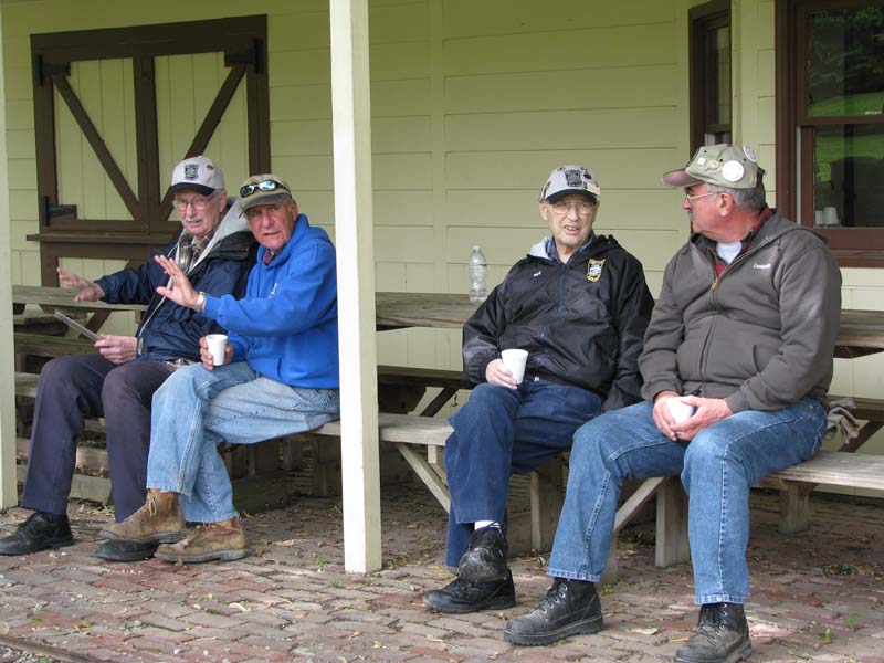 Chet Roberts just filled his tender with coal and will soon be departing the station with his passengers. Roger Harnish is loading passengers on Ken Brooks train as our counter, Dave Foster talks with Dick Clark at the station. |