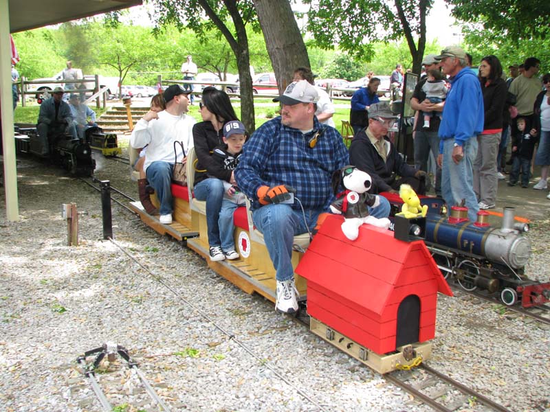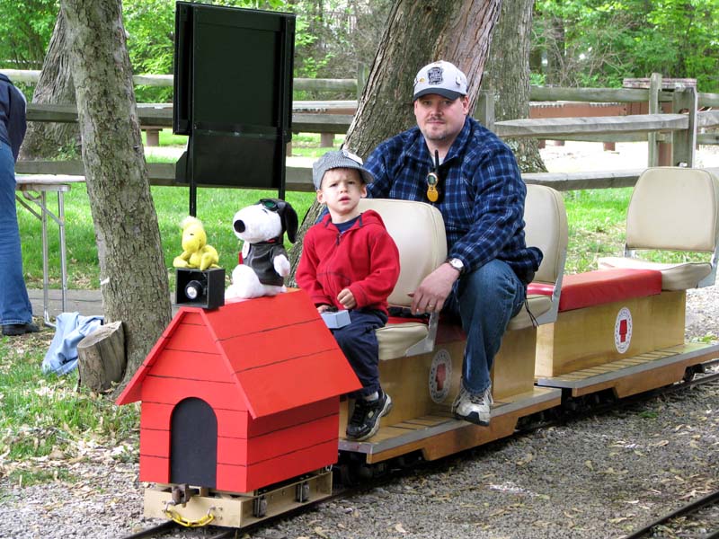 Dick Clark, Roger Harnish, Rex Shriver and Dave Foster share the good old times on the benches in front of the station before the run. Ethan and John Deptowicz running the Snoopy train before the Public Run starts. |