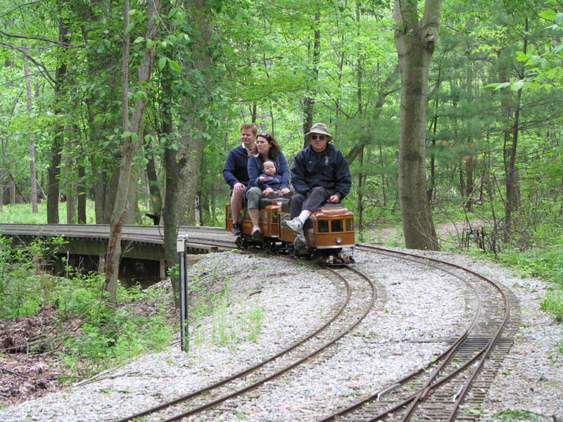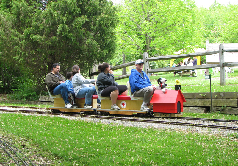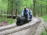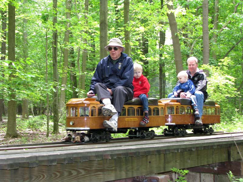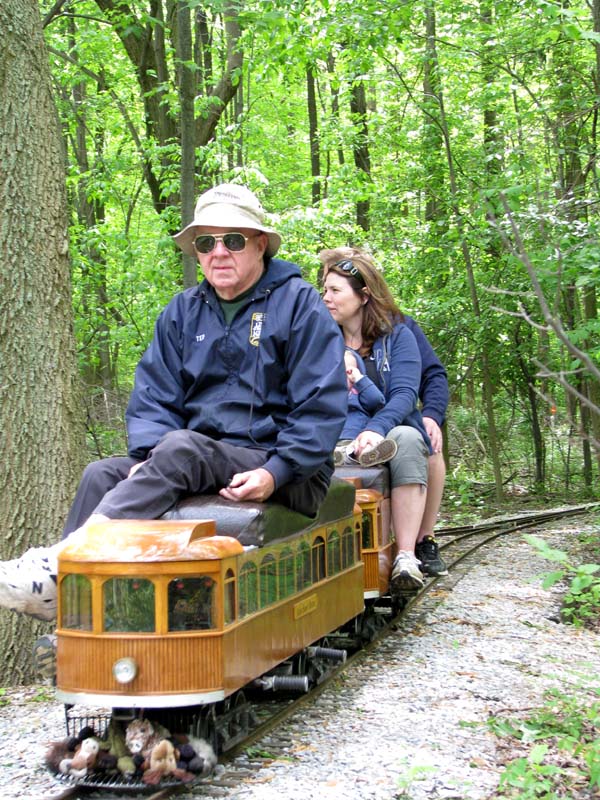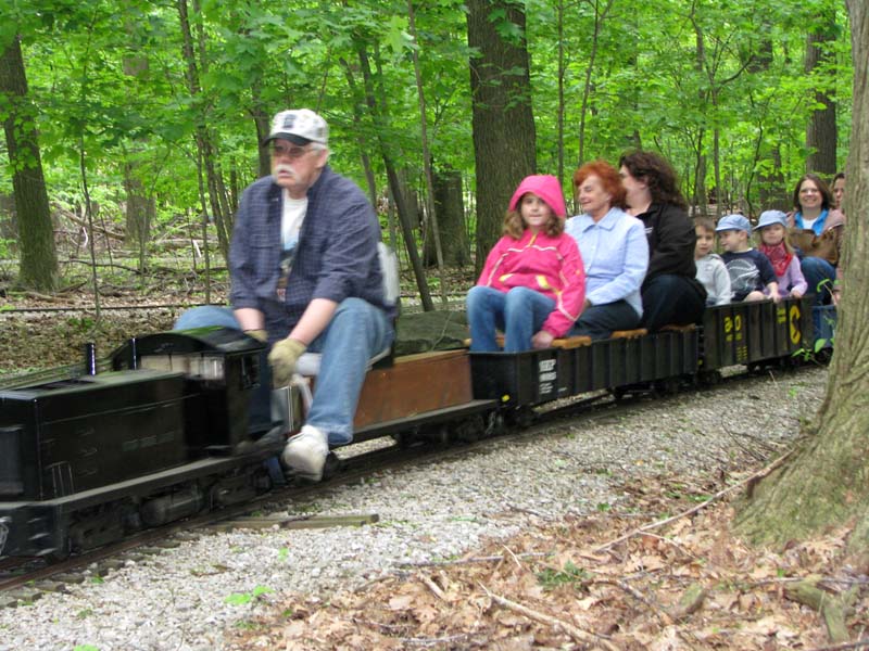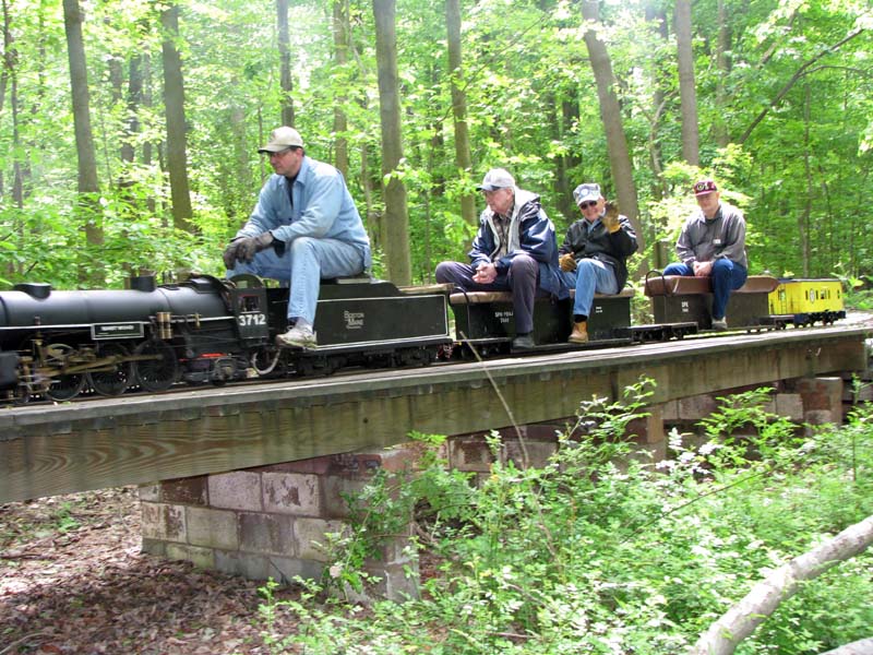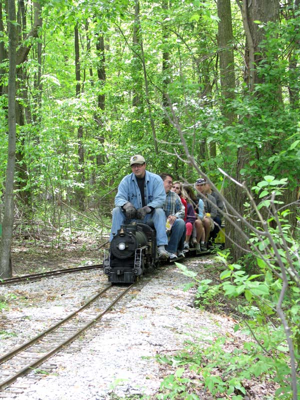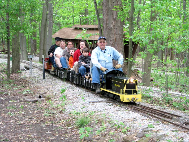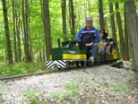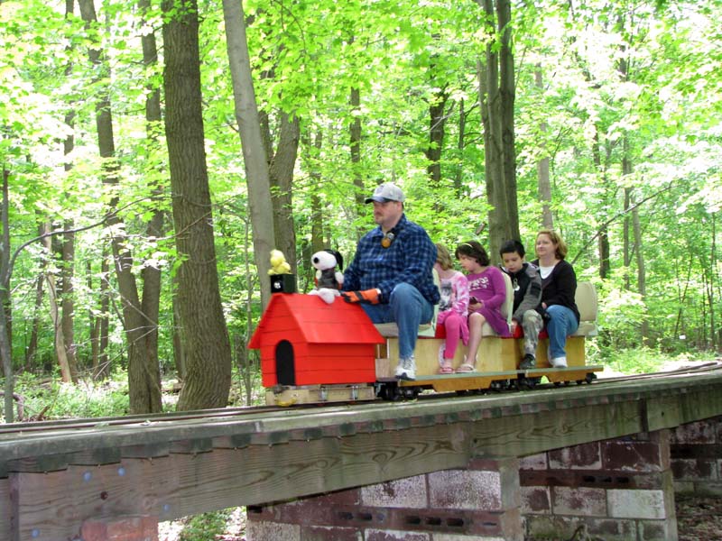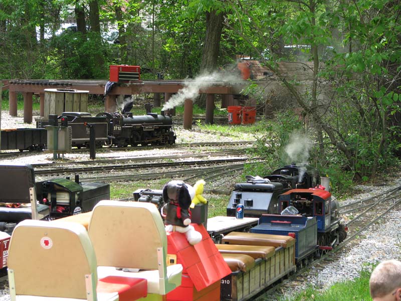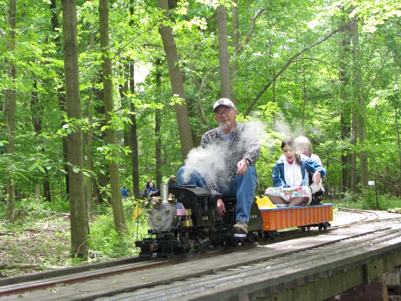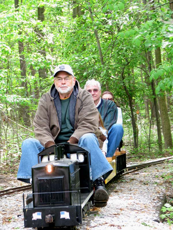 Bill as engineer of the Snoopy train with load of passengers who seem to be enjoying the ride. Frank after passing over the Cider Bridge takes the switch that will lead his train to the front of the station. |