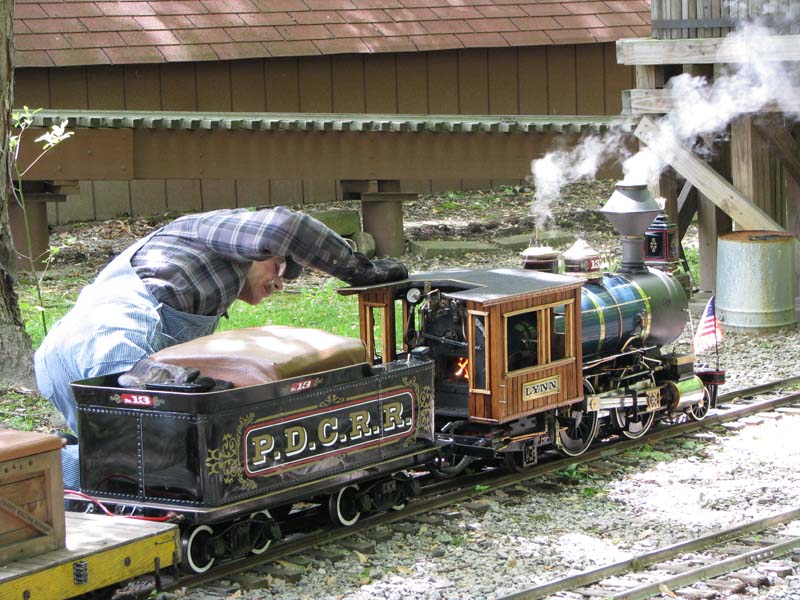 Jeff at the end of the run looking at the traffic ahead as he comes into the station to unload. John leaving the station with a full load of passengers as Mike behind him tends to the camelback steamer. |