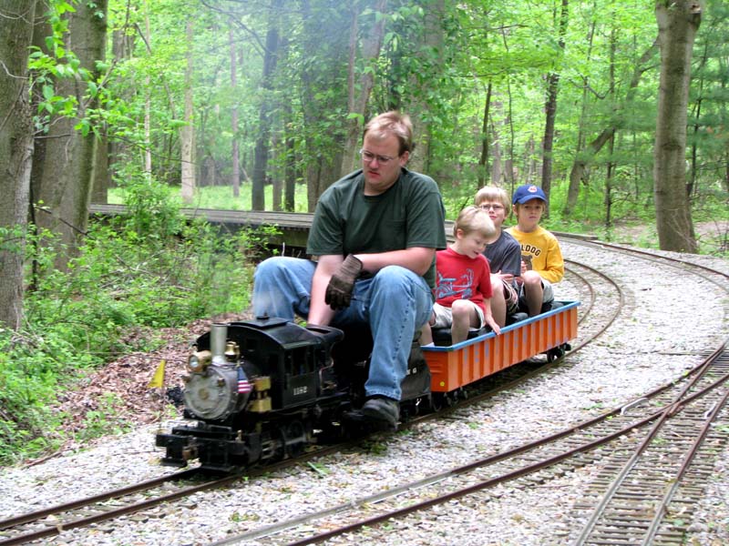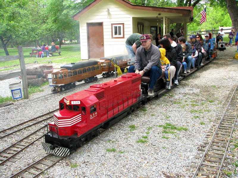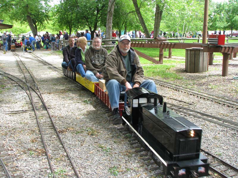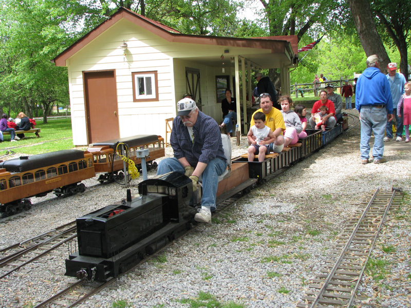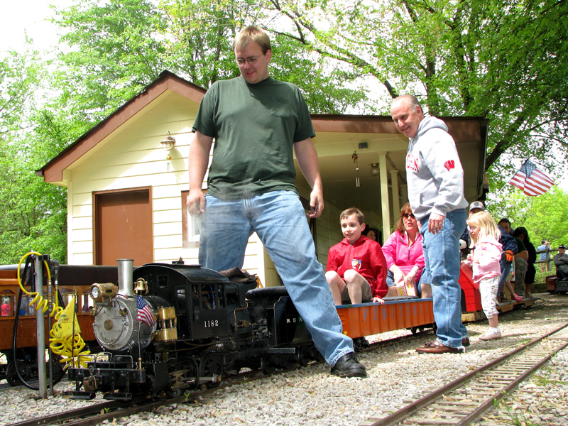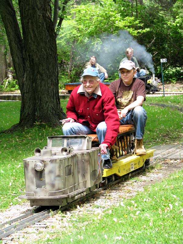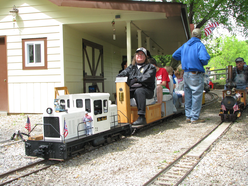 Josh Frank giving rides on the military switcher of George Metts. Paul Emch on the loop behind the station is nearing the end of his run with only a few more minutes before passengers will disembark from the train. |