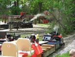 Mike leaving the station with another load of riders as Rick Nagy waits for his train to load. Skip is loaded and just begins to open the throttle at the start of his next run. |