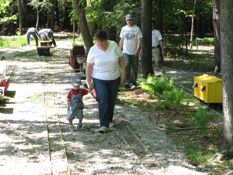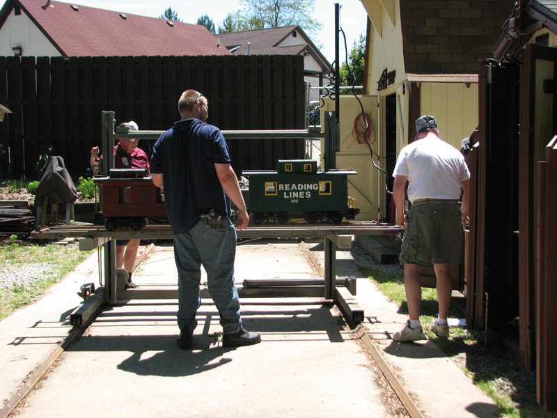 The guys are using the transfer table lift to get cars out of the storage shed to make up the trains. Ethan Deptowicz and Robbi Haines stroll through the yard with Marty Pinkston behind them. |