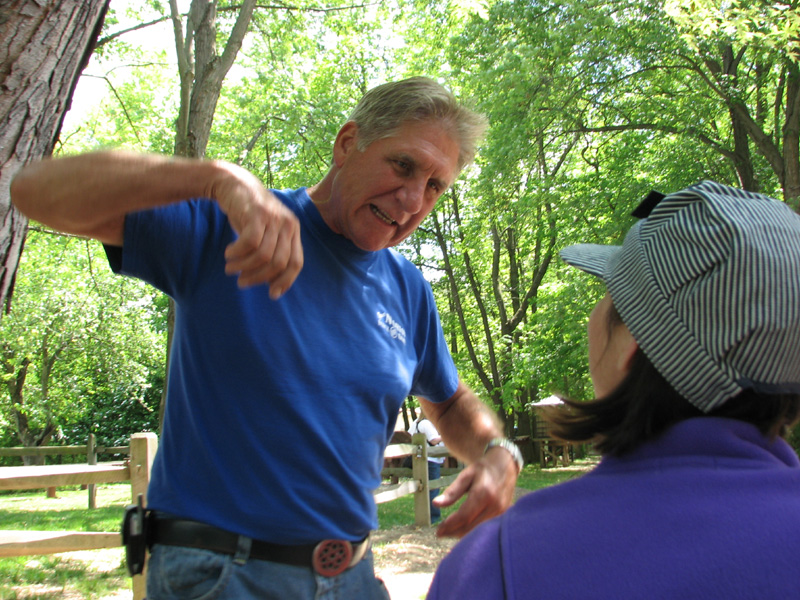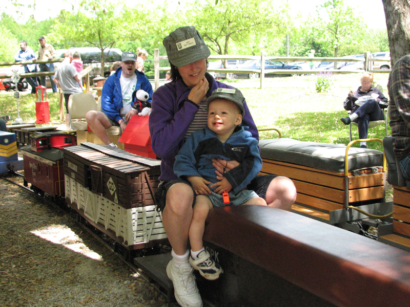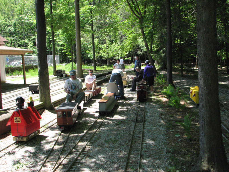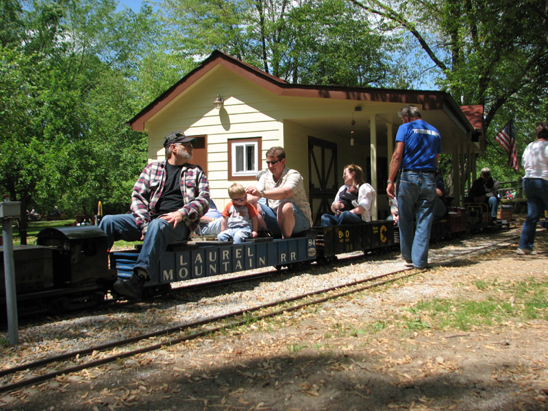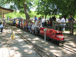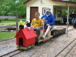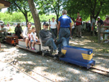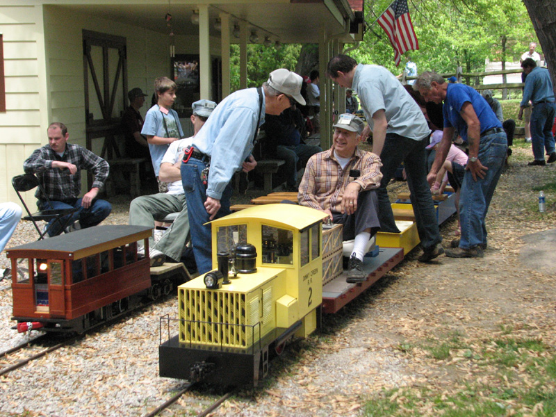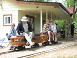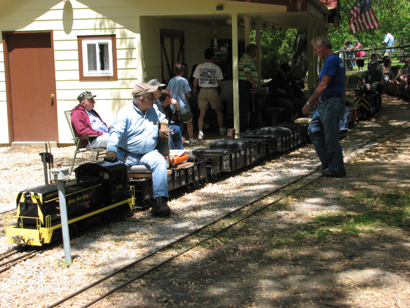 Marty at left watches as Roger checks the passengers on Dick Clarks train. Rick waiting for passengers to load is hauling three eight foot riding cars. |