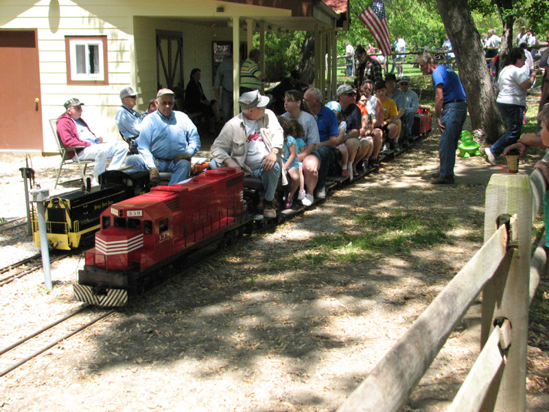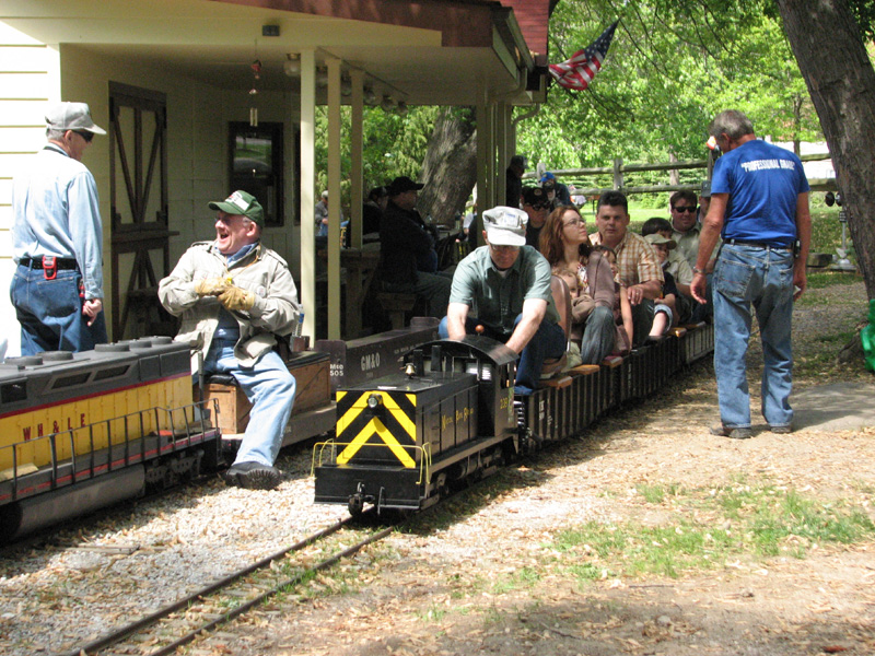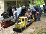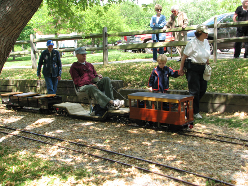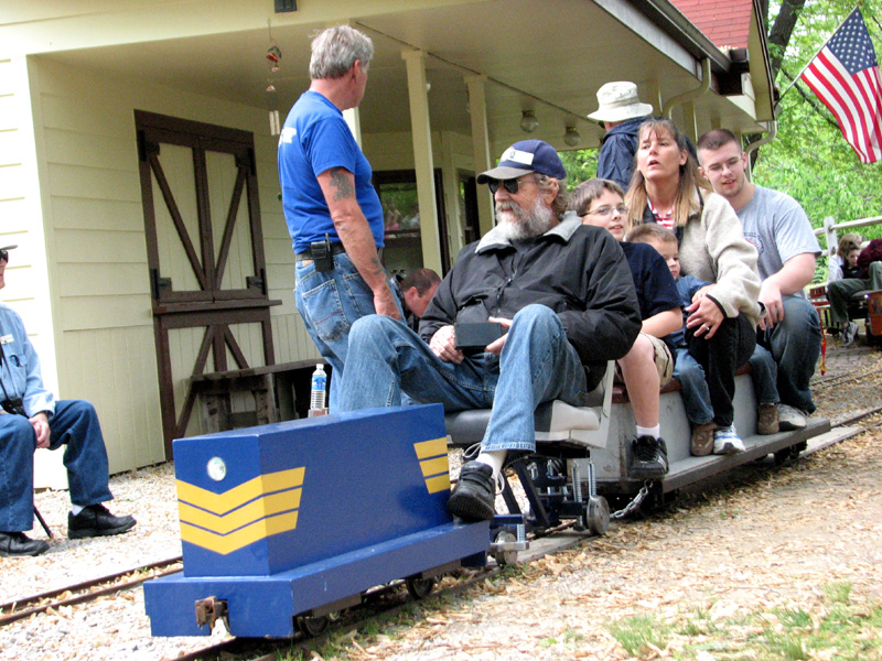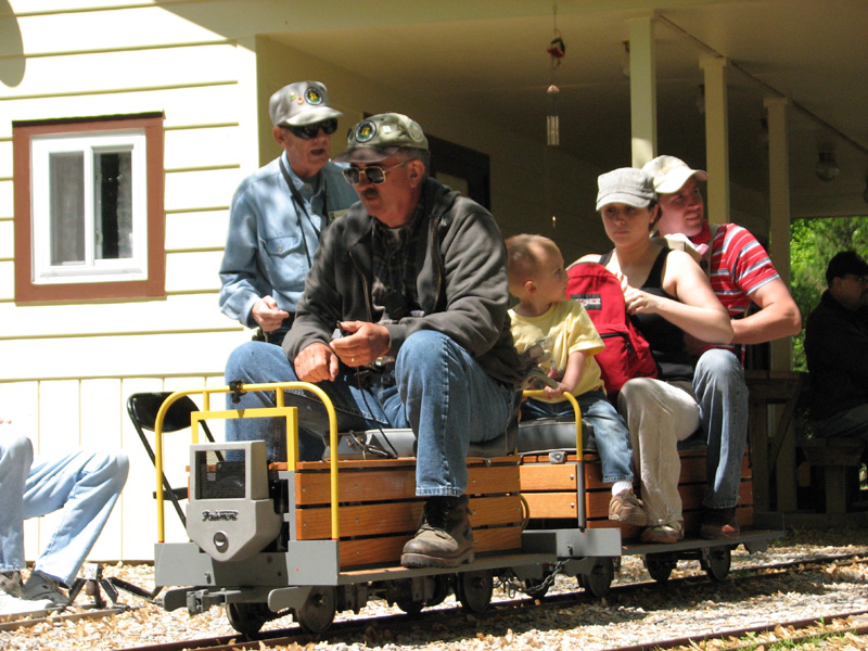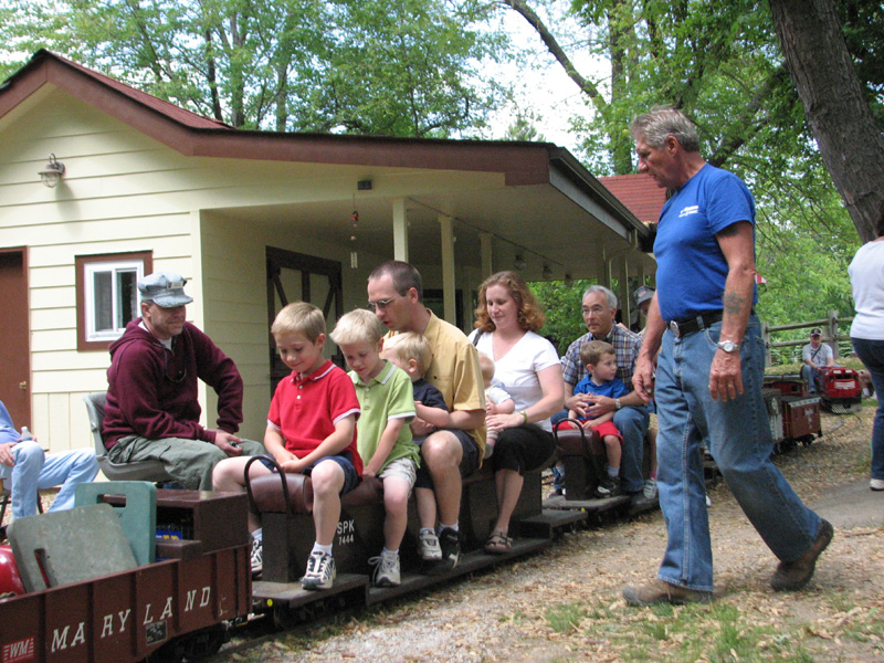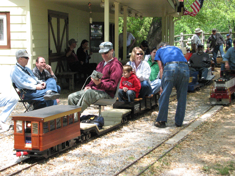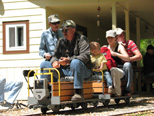 This is what the trains are all about..happy faces with the anticipation of the ride. Bill Bodemer, Bill Besselman and Paul Emch with Ken getting loaded with passengers by Roger Harnish. |
