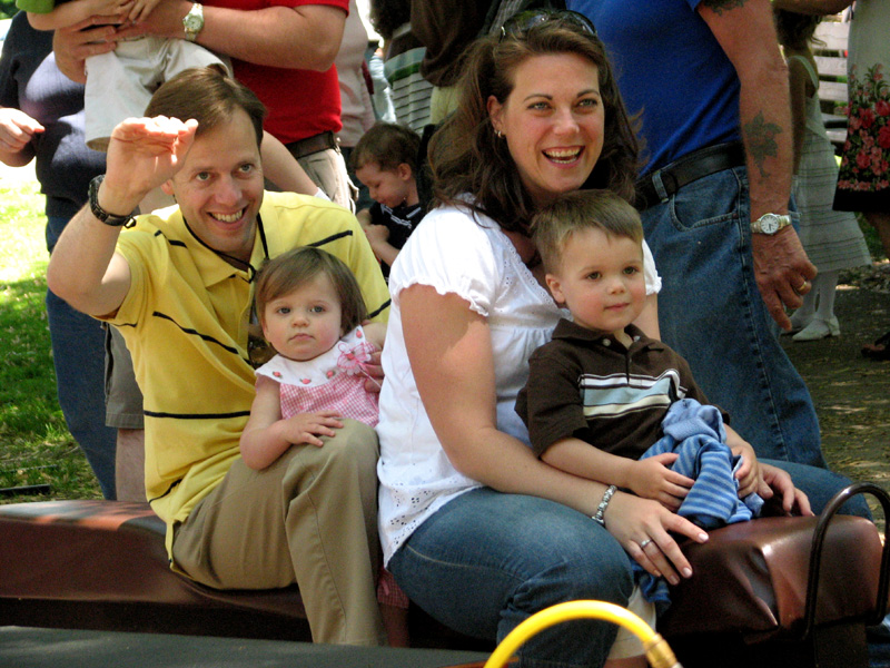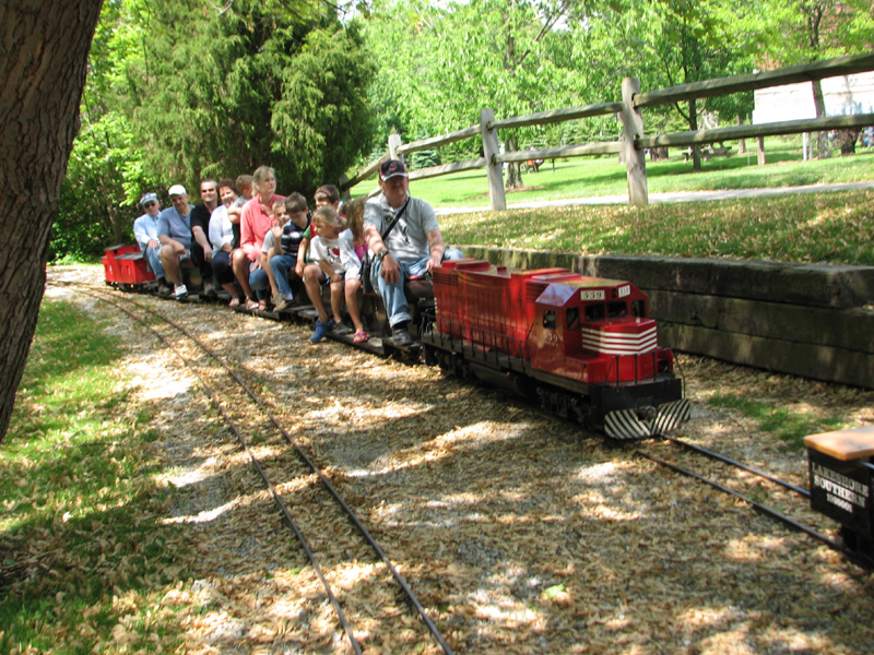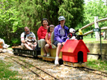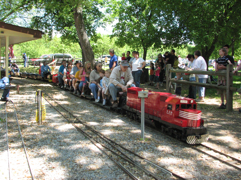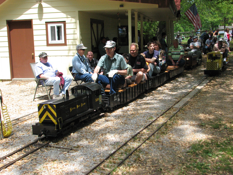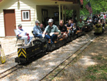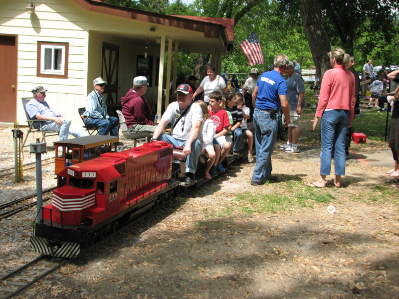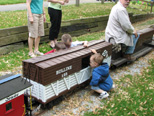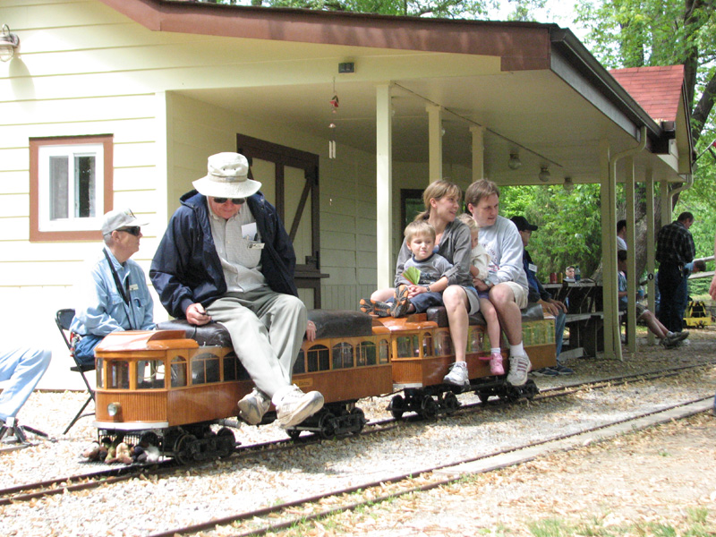 This is what the trains are all about..happy faces with the anticipation of the ride. Bill Bodemer, Bill Besselman and Paul Emch with Ken getting loaded with passengers by Roger Harnish. |