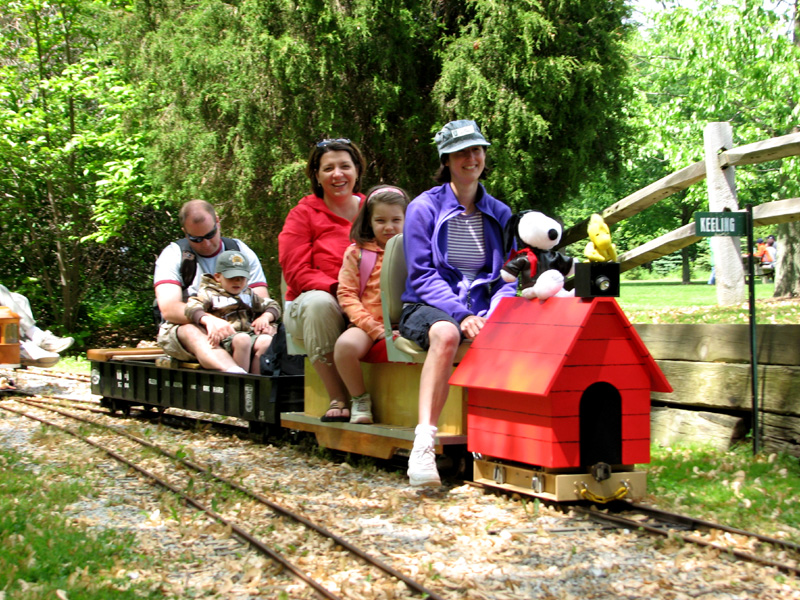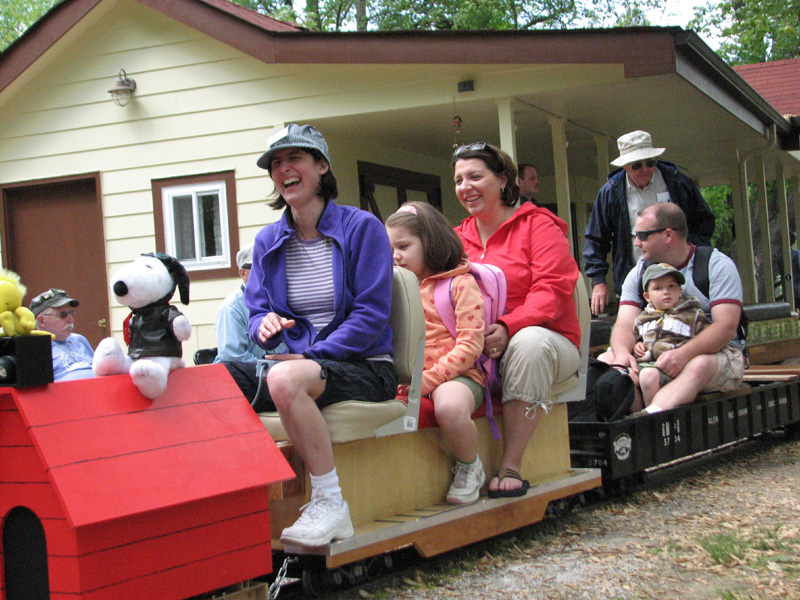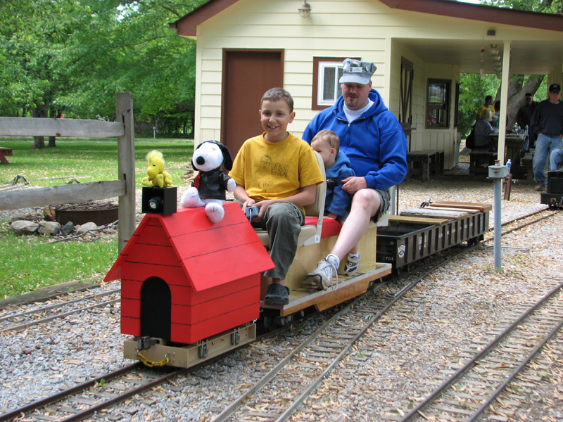 With John Deptowicz and the Snoopy train behind her, Amy Deptowicz takes on her first time duties as conductor with Ethan. Wally Pausch looks over his shoulder for Roger to give him the "All Aboard!". |