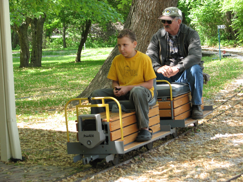 Richard Sales with his unique rider car behind his box cab unit as he leaves the station. Bill Besselman, who is sitting across from the loading area, is our passenger counter for today. |