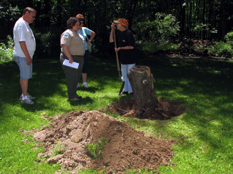 A picture of the three-light signal with its support post that Paul Emch donated to the club which will be erected when a location is chosen. Paul and Anna Zorko listen as Pat Morse from the Park Service talks to Edith Hacker who's digging out the stump of an apple tree the Park cut down. |