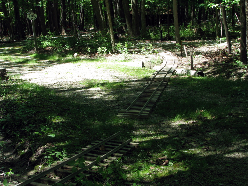 Paul, Wally Pausch, Lew Fowler, Jerry Bell and Dick Clark watch as John Koontz (behind Dick) measures the angle with a square. A view looking down at the crossing to show the angle involved, which will be made up with steel ties and steel rail with a machined frog. |