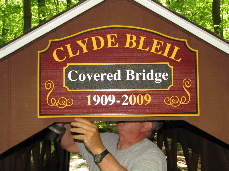 A close-up of the plaque to be dedicated at the Open Meet on June 18 with Clyde's family in attendance. A view of the Covered Bridge with the plaque in place. |