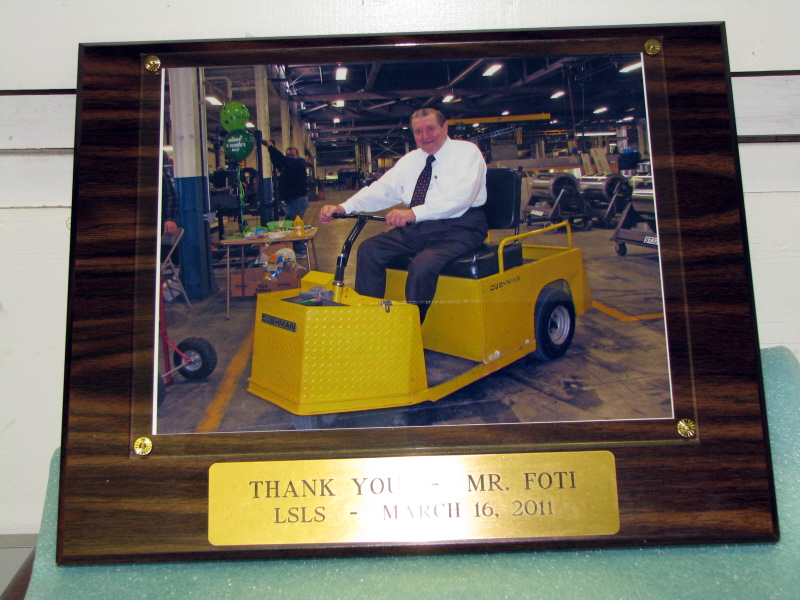 John, Dave Foster and Jerry trying to decide the final outcome for the degree of angle for the crossing. Dick Clark had this plaque made up to present to Mr. Sam Foti on June 18th to thank him for the use of Hose Master's facilities where we repair our equipment during the winter months. |