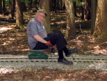 Dick Clark on the Branch Line above High Creek checking out the track for level and raising it as needed. A rear view of the Park Engine with the foot pegs laying on the running board waiting for installation. |