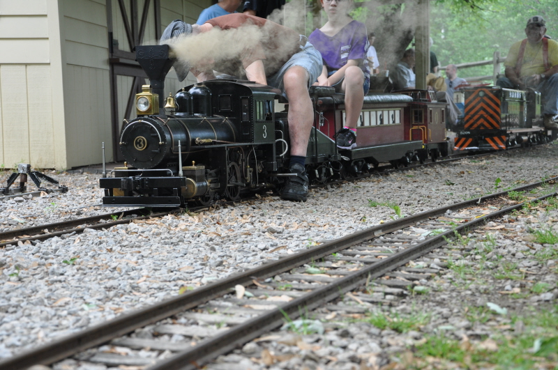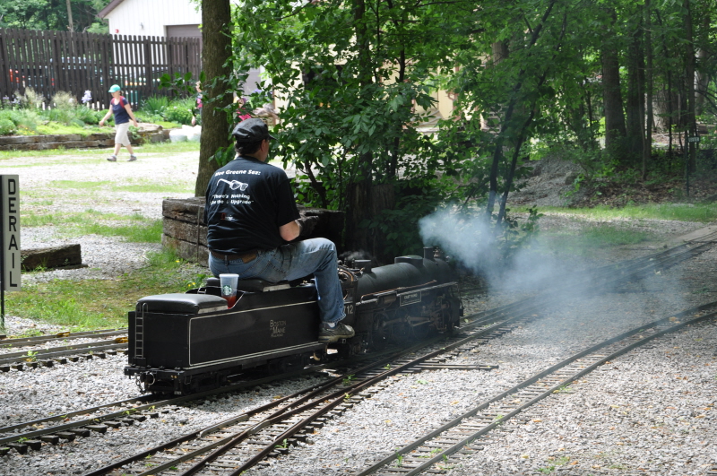 This close-up view makes it look as though Bob's got his head in the smoke, but it's actually off to the side as he fires the steamer. Scott Hewis with his diesel waits for Bob to get things sorted out on the firing of his steamer before he can start his next run. |