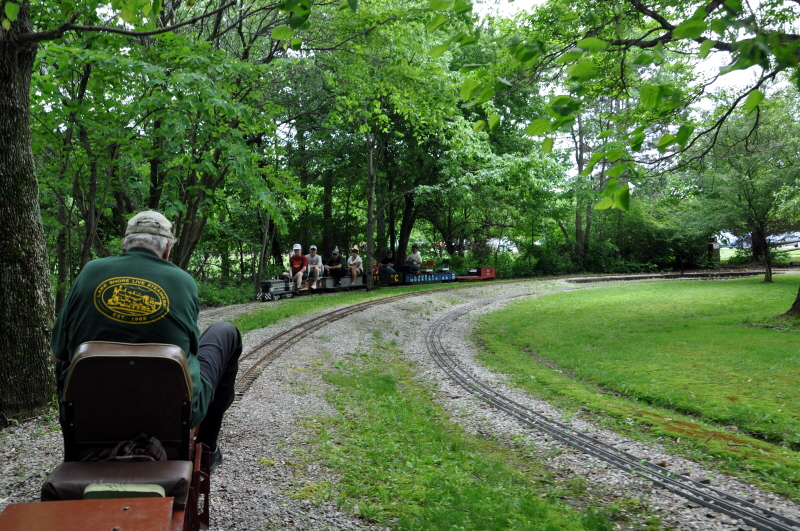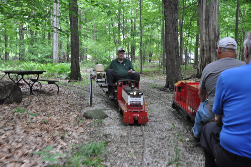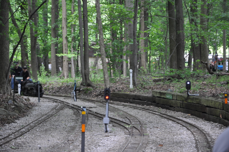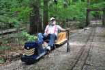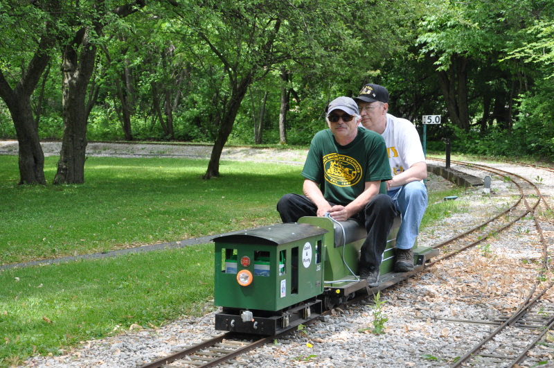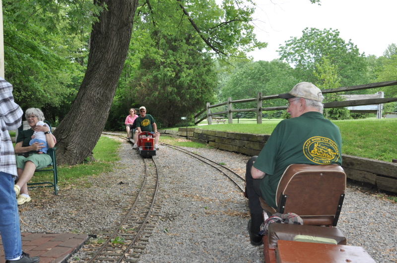 Ken Vendlinger with his train eastbound has he heads towards the station with his passengers after having just coming off of the Branch Line. Don Speidel with his train leaving westbound from the station and he has two of the passengers that were on Kenny's train. |