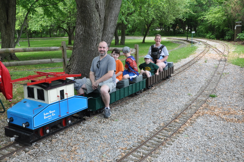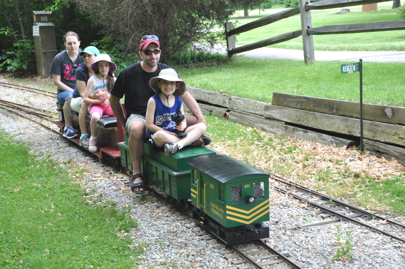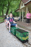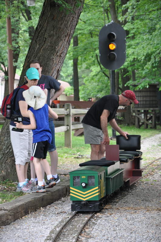 This view of the activity at the station with three trains that had arrived and have not yet departed cause a lineup until the ones ahead depart for their next run. Sean arriving back at the station with his youngest daughter running his box cab powered train with the family. |
