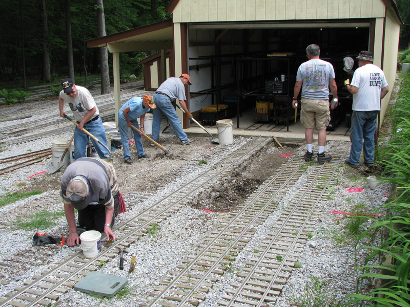 When the rest of the crew shows up with the tools we will have to remove the five sets of tracks going into the storage barn.Dick Clark is dis-assembling the track panels as Steve Zaken, Edith Hacker and Frank Foti dig with Dave Foster and Wally Pausch on the right. |