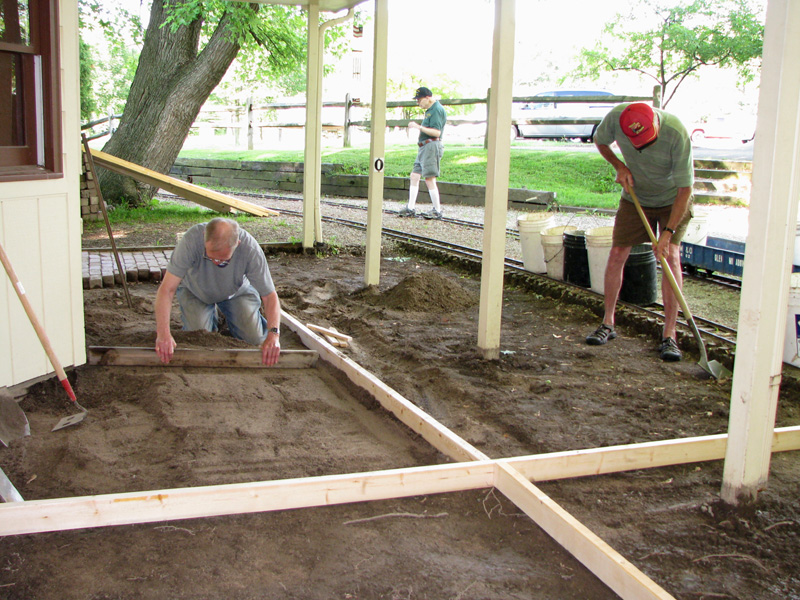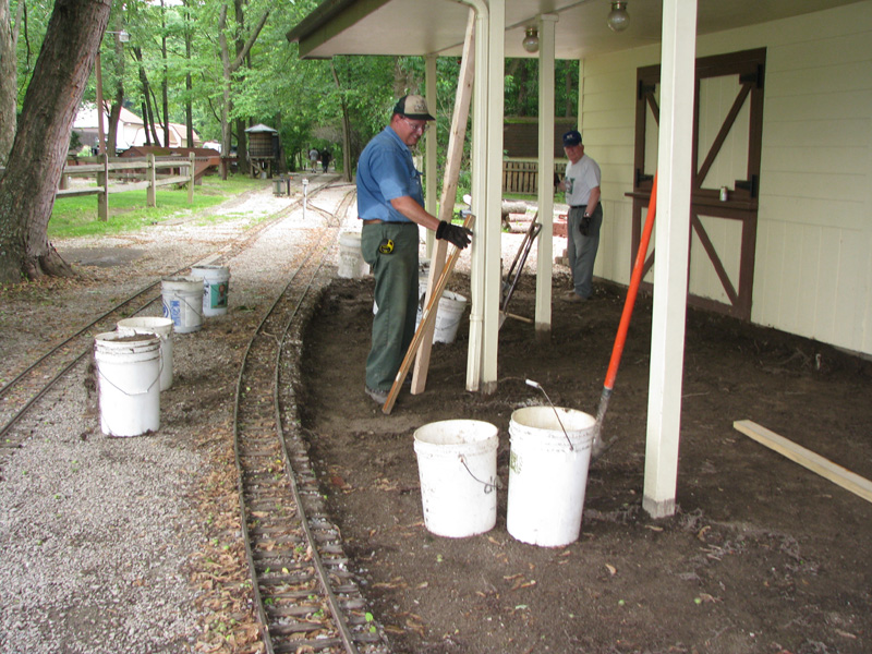 Back at the station Lew Fowler was helping Karl Losely dig out the rest of the dirt and stone that was beyond the pavers. As Karl and Lew filled the buckets the work train would come and haul them off ot be dumped. |