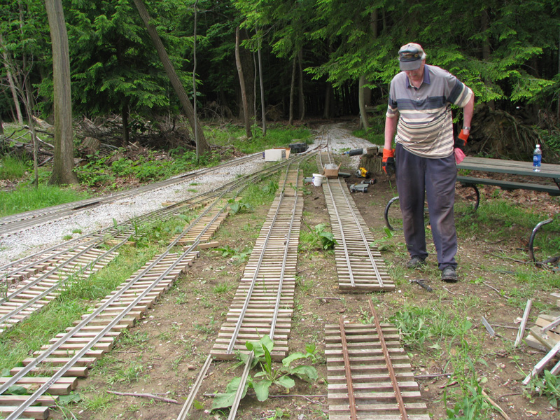 Rick and Dick are bolting in the track panels to the switches at the far end of the yard. View from the other end shows the track just lying in place ready to be bolted together. |