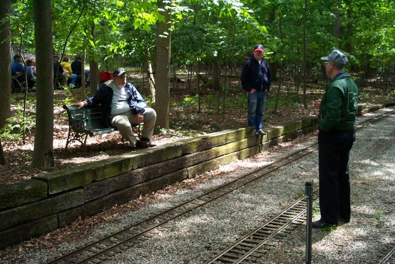 Mike Uhrich, on bench, is the ever watchful eyes at our runs for trouble with our trains and is talking to Ron Trenhaile with Rick behind. Marcel at Horrendous as the Hudson starts to coast down the grade to Filmor. |