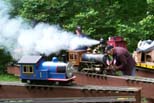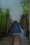 Skip leaving with the cylinder cocks open to blow out the accumulated water from sitting. Frank leaving the station with his load of passengers as Brent Lane waits for the rails to clear so he can load. |