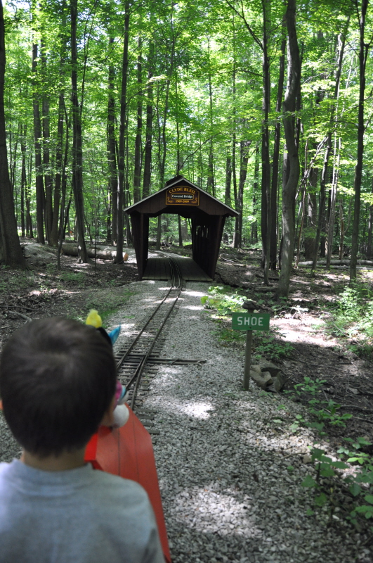 Notice in this picture how the rails accomodated the new growth of the tree! Ethan Deptowicz heading for the covered bridge as he drives the Snoopy train on its shakedown run on his way to the station. |