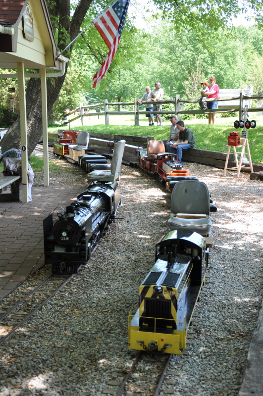 The crew chowing down prior to beginning the public run which celebrates the "Railroads in the Park" sponsored by Lake Metroparks. Ken Vendlinger working on his green switcher engine just behind Rex Shriver's Role Models Switcher engine on the sidings at the station. |