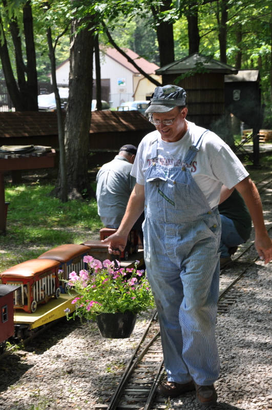 Jeff Ridler and family with their electric-powered box cab engine and cars parked on the siding by the station waiting for the run to begin. Karl Losely carrying a hanging basket of petunias towards the station prior to the run. |