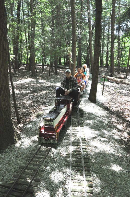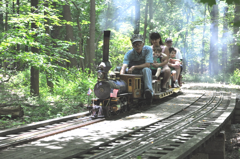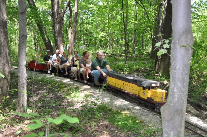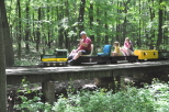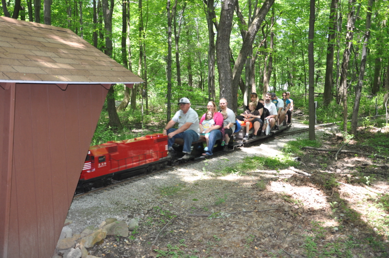Dick Clark coming out from the Covered Bridge with a load of happy passengers. Rick Nagy at the controls of the club's GP38 engine about to enter the Covered Bridge with a full complement of passengers. |