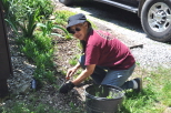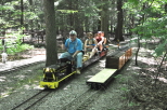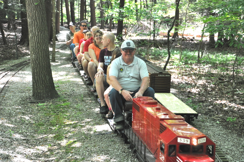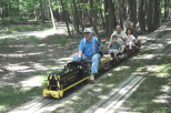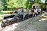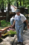 Marie Nyland tending to her garden she created along the fence in front of our Switch Building. Scott Hewis at the controls of Paul Emch's NKP train on the grade crossing for the Park Access Road just past Zip Junction with his passengers. |