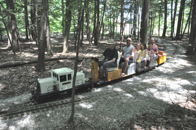 John Deptowicz having just passed Mackey's Run with the Snoopy train will soon be rumbling over the Big Bend Bridge. Jeff and his passengers wave to the photographer after having just passed through Mackey's Run. |