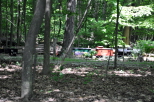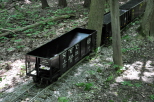 Rick with Steve Zaken, as conductor, are about to pass through the Truss Bridge with a trainload of passengers. Scott passes the cars set out on the Fern siding as he heads for the Truss Bridge. |