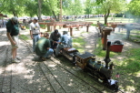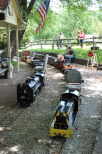 Skip Frank sitting on his tender in discussion with club members about brake lines prior to the run. A view showing the line of waiting passengers for their turn to ride the trains which extends all the way up to the Nature Center -- it's going to be a good day. |