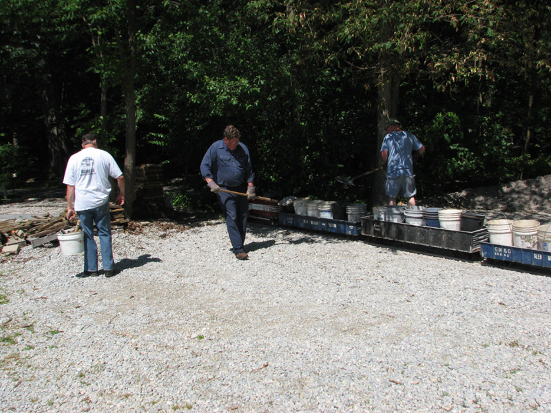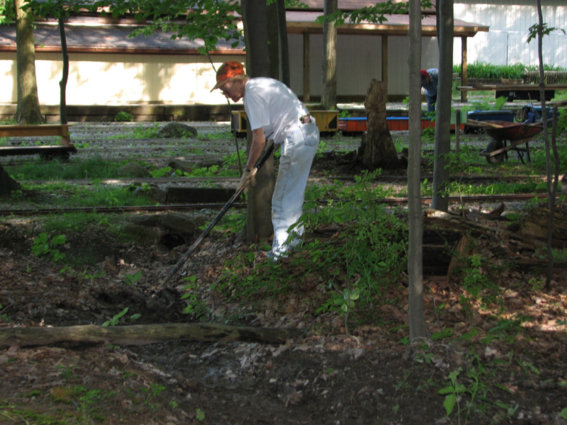 Wally Pausch is getting more steel angle for another pair of "rails". The guys extended the track from in front of the steaming bays, over the tree stumps that were ground out, to the loading area for our Public Runs. |
