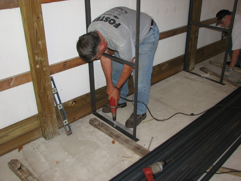 Dave is drilling the concrete floor for a anchor to fasten the support frame in place. Dave is putting rail spacers between the 1/2" square rods that we are using for placement on the floor as rails for the cars. |
