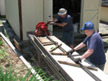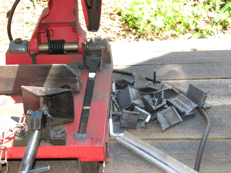 Ted Nyland on the chop saw with Lew assisting with holding the steel as the angles are cut to length. The angles were burnt off to approximate length and the guys cut them to length with a nice straight cut for a butt joint connection. |