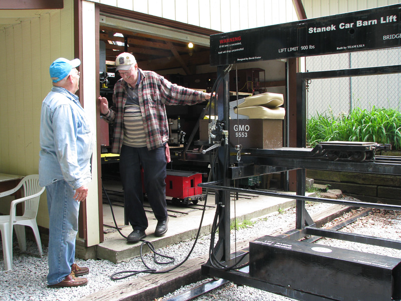 In this view you can see he has a heavy Plexiglas plate mounted over the terminals so they don't short out with the body shell or wayward hands with a wrench in them. Paul Emch and Dick Clark in conversation by the Stanek Car Barn Lift. |