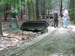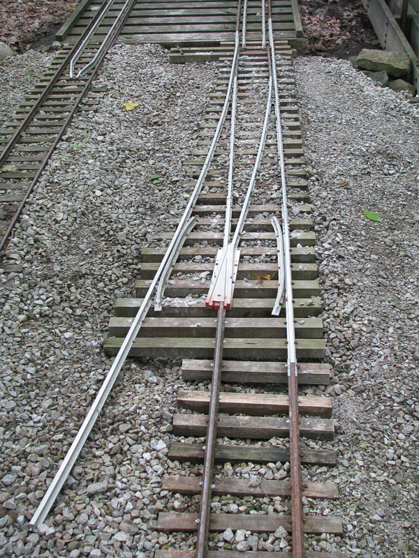 This is the end of the switch which is so close to the bridge that the bridge guard rails are past the end of the points and the guardrails should be bent inward. Dave Cryor, Frank Smoley and Steve Zaken as they walk along cleaning the leaves from the trenches between Horrendous and Filmor. |